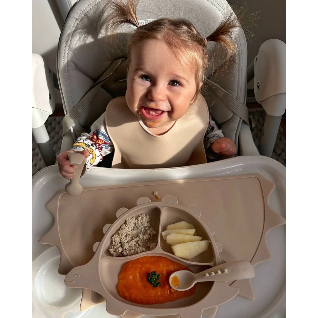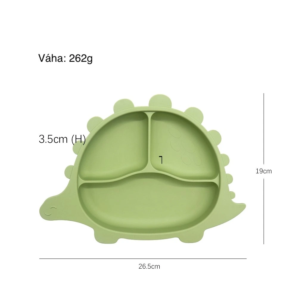Detský silikónový tanierik s prísavkou v tvare dinosaura je dokonalým spoločníkom pre malé deti pri jedle. Jeho veselý dizajn podnecuje deti k objavovaniu nových chutí a zábavnému jedeniu. Tri oddelené časti tanierika umožňujú praktické usporiadanie rôznych druhov jedál, čím podporujú pestrosť v stravovaní. Vyrobený z bezpečného a odolného silikónu, tanierik je ideálnou voľbou pre aktívne deti, pričom prísavka zabezpečí, že tanierik zostane pevne na mieste počas celého jedla.