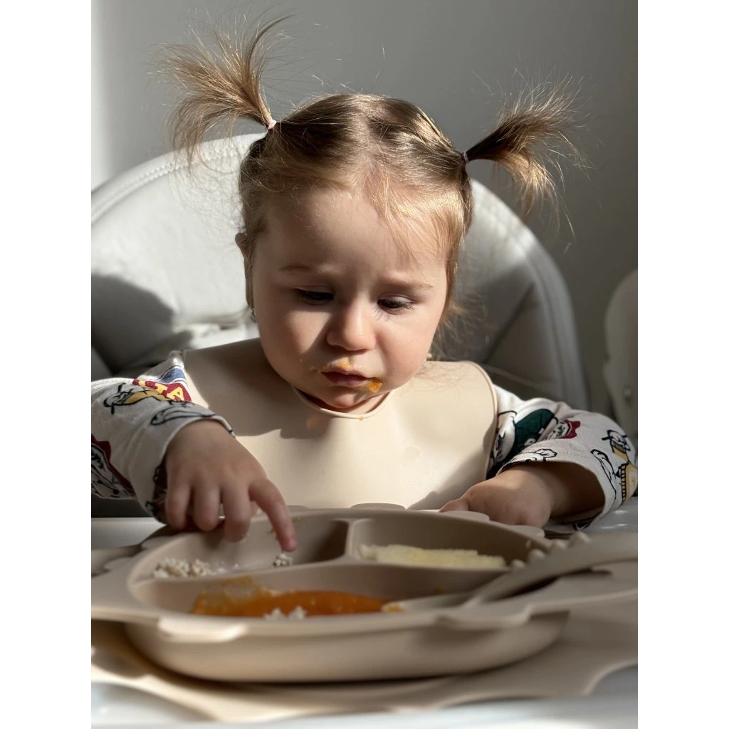- Silná prísavka: Stabilizuje tanierik na stole, zabraňuje jeho skĺznutiu a minimalizuje neporiadok počas jedla – ideálne pre malé deti, ktoré sa učia samostatne jesť.