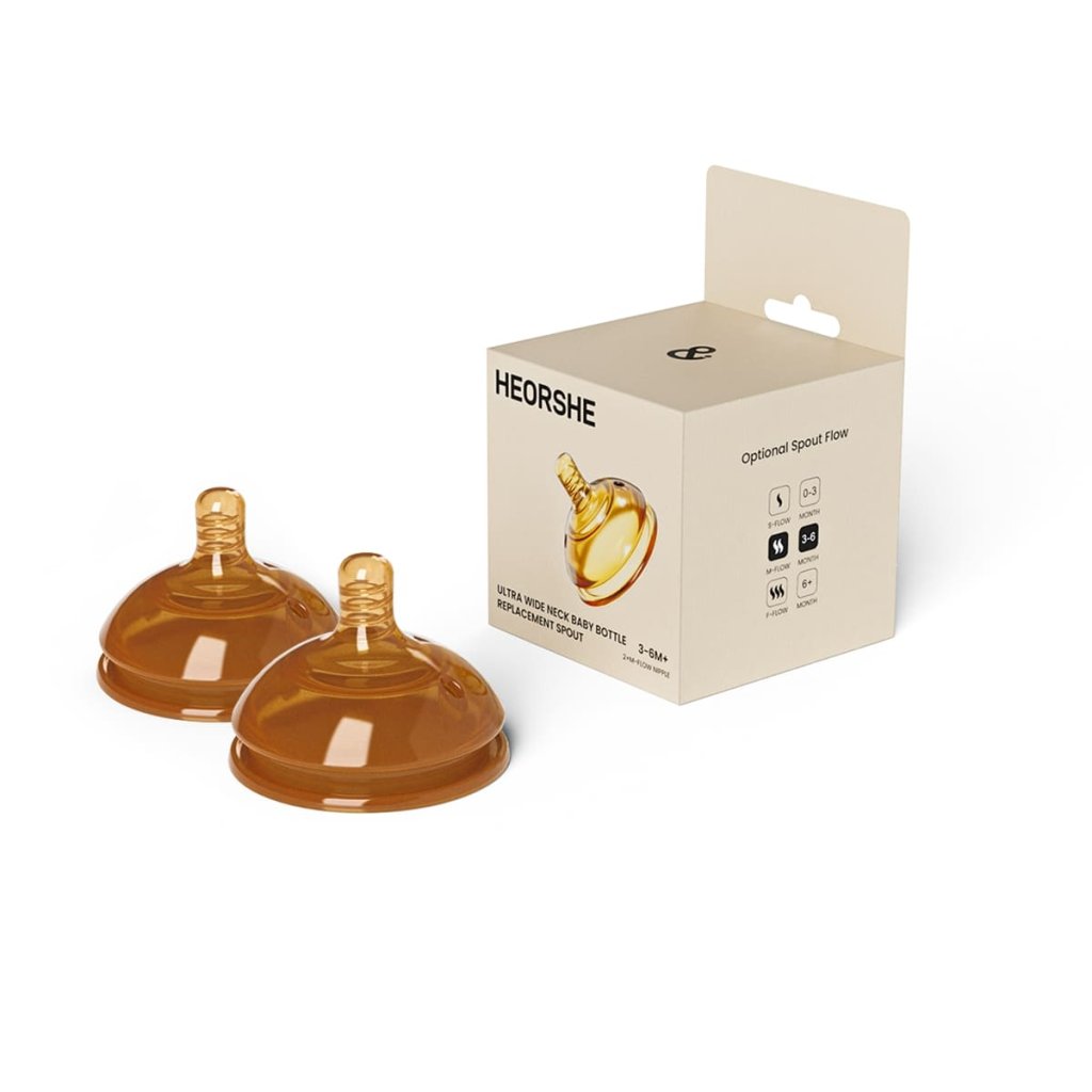 HEORSHE náhradné cumlíky na dojčenskú fľašu, ktoré napodobňujú tvar maminej bradavky a disponujú antikolikovým systémom. Vyrobené z jemného, BPA-free silikónu, vhodné na sterilizáciu do 180 °C. V balení sú 2 kusy s rovnakou rýchlosťou prietoku – vyberte podľa veku dieťaťa (3–6 mesiacov alebo 6+).