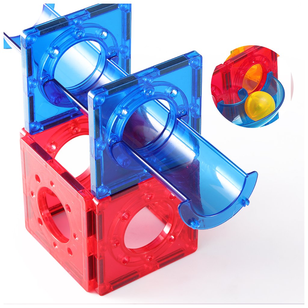 S dráhou môžu deti experimentovať s rôznymi výškami, schodovitými úsekmi a priehľadnými tunelmi, sledovať, ako guľôčky prechádzajú traťou, a objavovať nové trasy a kombinácie.