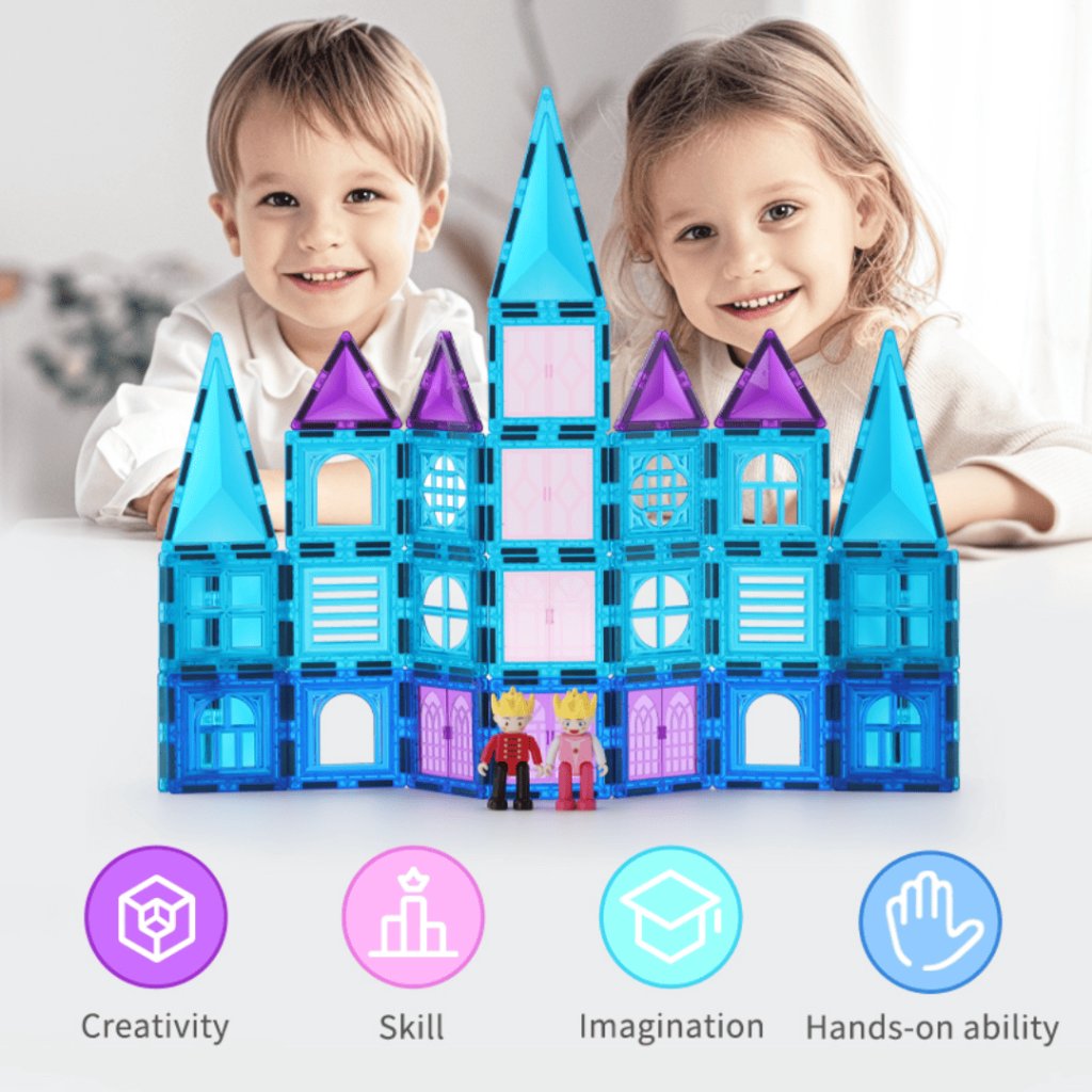 Čarovný svet ľadu priamo doma! Táto stavebnica obsahuje magnetické trblietavé dieliky, dve postavičky – princa a princeznú, otváracie dvere a okná a dva dieliky schodov. Deti si môžu skladať vlastný hrad, rozvíjať fantáziu, jemnú motoriku a tvorivé myslenie, a užiť si hodiny bezpečnej a zábavnej hry.