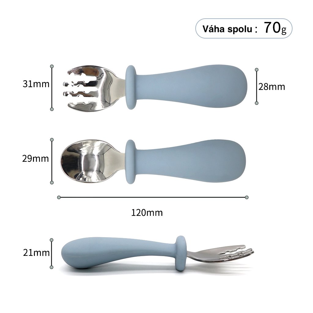 - Ergonomický dizajn: Elegantné silikónové rukoväte sú navrhnuté s hrubším vrchom, čo zlepšuje manipuláciu s jedlom a poskytuje pohodlné uchopenie. Tento praktický dizajn zabezpečuje, že príbor pevne a pohodlne leží v ruke, čo deťom pomáha ľahko ovládať príbor a užívať si jedlo s väčším komfortom.