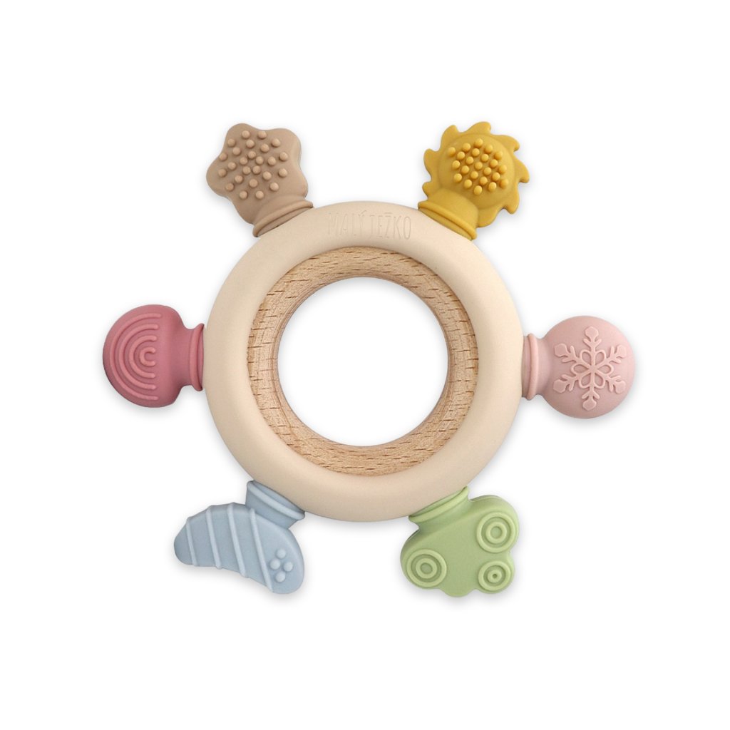 - Ergonomický dizajn: kruhový tvar s dreveným stredom a silikónovým povrchom uľahčuje uchopenie a poskytuje úľavu pri prerezávaní zúbkov.