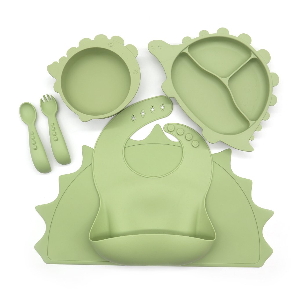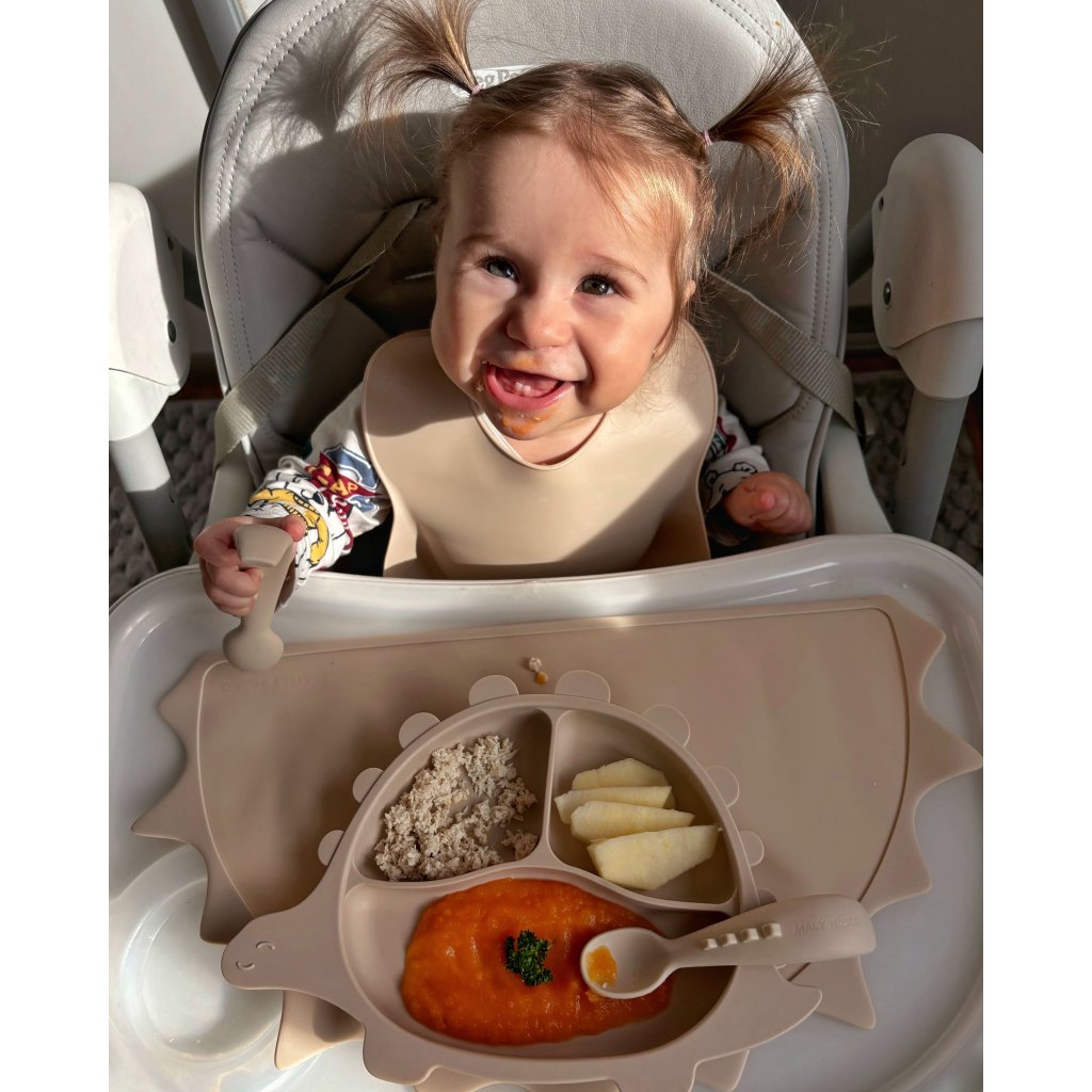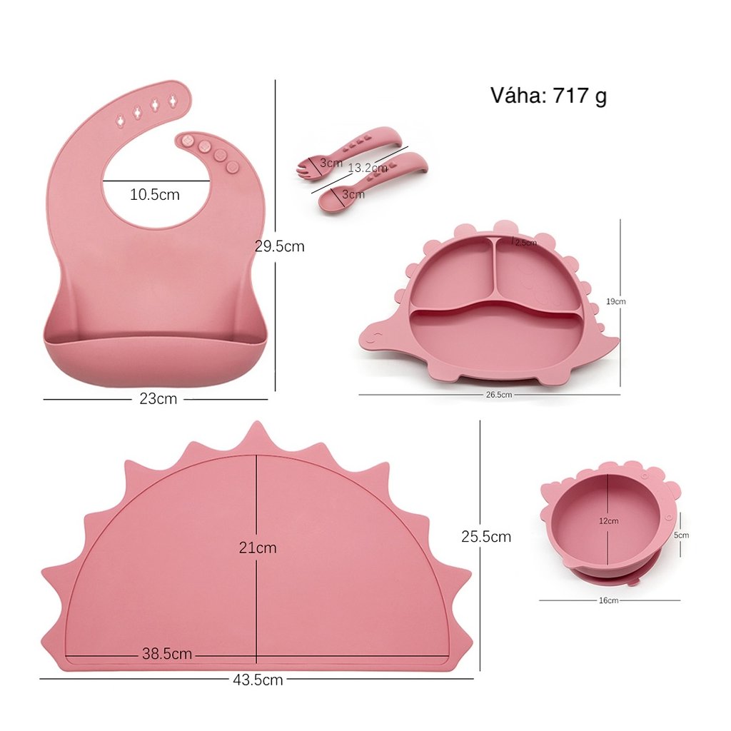Vstúpte do sveta zábavného stolovania s naším 6-dielnym silikónovým jedálenským setom "DINO", ktorý je navrhnutý tak, aby urobil z každého jedla nezabudnuteľnú a radostnú udalosť pre vaše dieťatko.