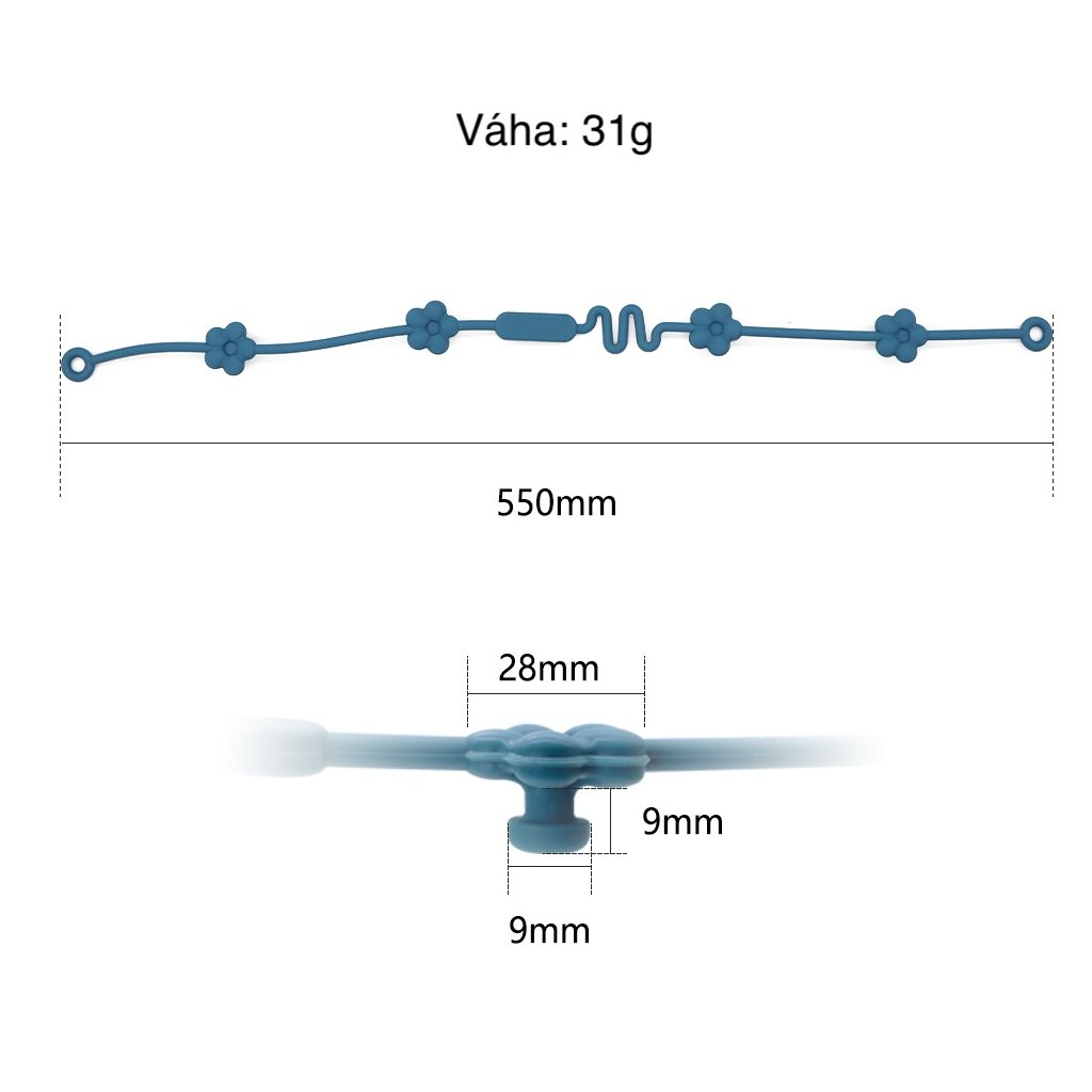 Upozornenie: Retiazka je vhodná na hryzátka so širším úchytom, keďže jej koncovka je pevnejšia a hrubšia – nezmestí sa do úzkych očiek.
